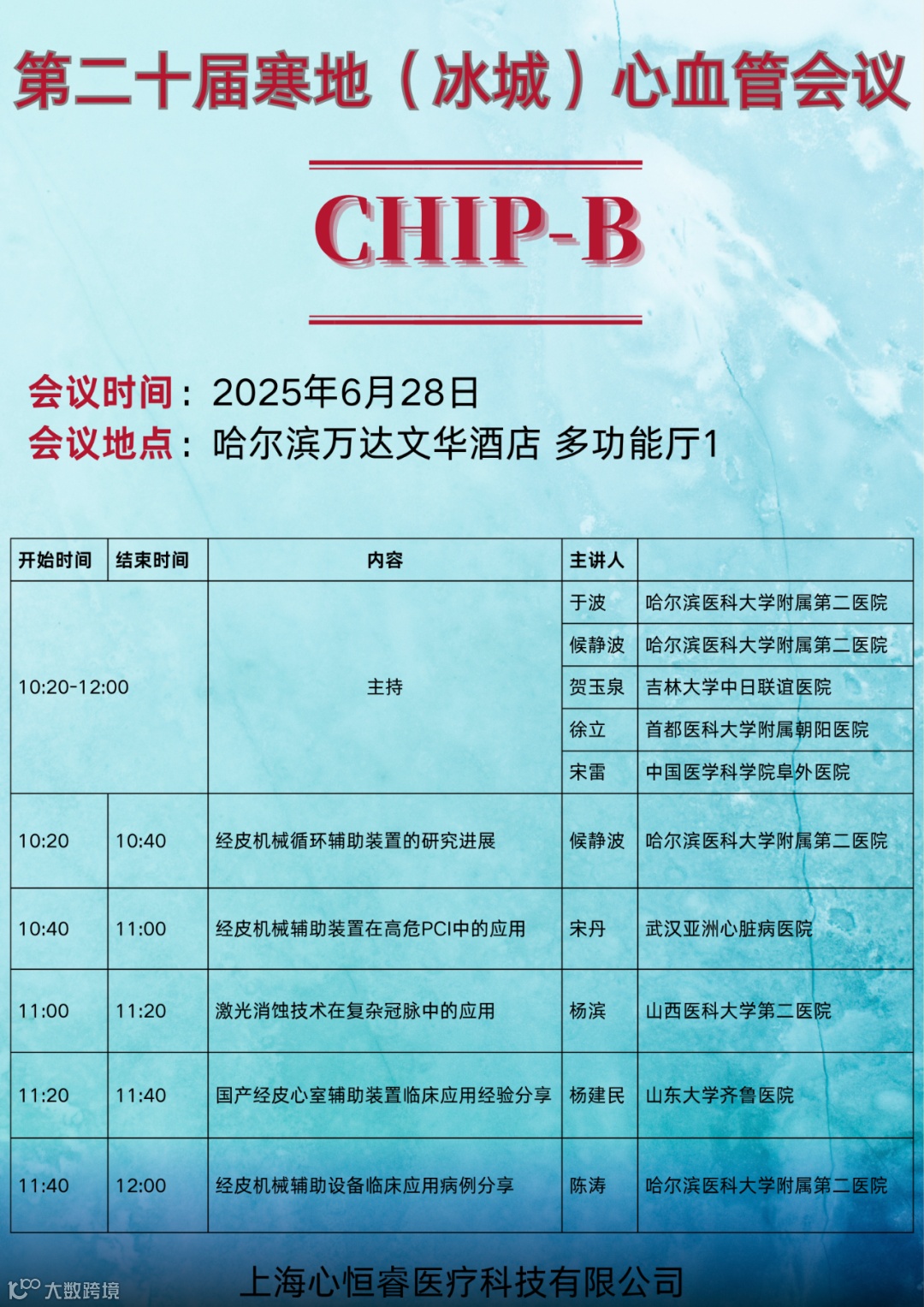 会议期间,心恒睿医疗将于6月28日在哈尔滨万达文华酒店多功能厅一举办“CHIP—B”学术专场,诚为行业先行者提供介入式心室辅助装置的探索方向,共同绘制高危PCI疾病诊疗的未来蓝图。诚邀您的莅临!