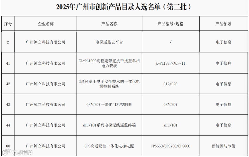 近日,2025年广州市创新产品目录入选名单(第二批)正式发布。在广州市科学技术局指导下,经广州市科技创新企业协会组织评审,绰立科技六项技术产品凭借其创新性与应用价值,成功入选该权威目录。本次入选的产品包括:电梯遥监云平台、CL-PL1000高稳定带宽抗干扰型单相电力载波、G系列基于电子安全技术的一体化电梯控制系统、GRACE07一体化门机控制器、MEU/IOT系列电梯无线遥监终端、CPS高适配性一体化电梯电源。