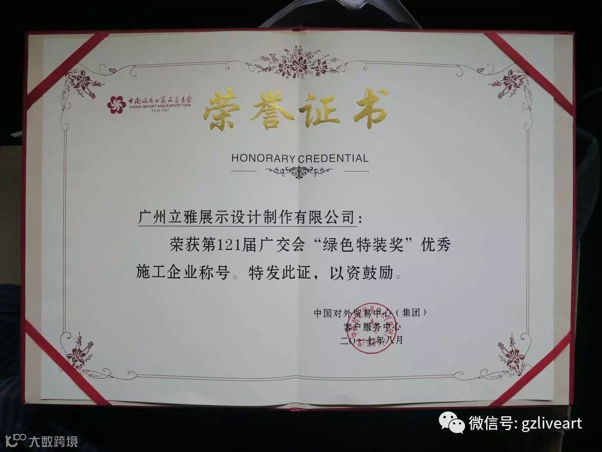 在本次大会中,中国对外贸易中心(集团)对第121届广交会优秀施工单位进行了表彰并颁发证书,而我司坚持以绿色环保特装为发展理念,在广交会绿色环保特装施工单位中更是起到模范作用,为此我司获得第121届广交会“绿色特装奖”优秀施工企业荣誉称号。