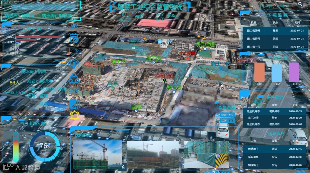 方式、工作方式和管理模式,同样运用三维实景技术实现施工现场可视化,其中包括智能AI监控、扬尘、烟感、环境监测、车辆人员定位、电子警戒围栏、考勤管理、物资物料管理、生产安全管理、信息及事件统计等模块功能。