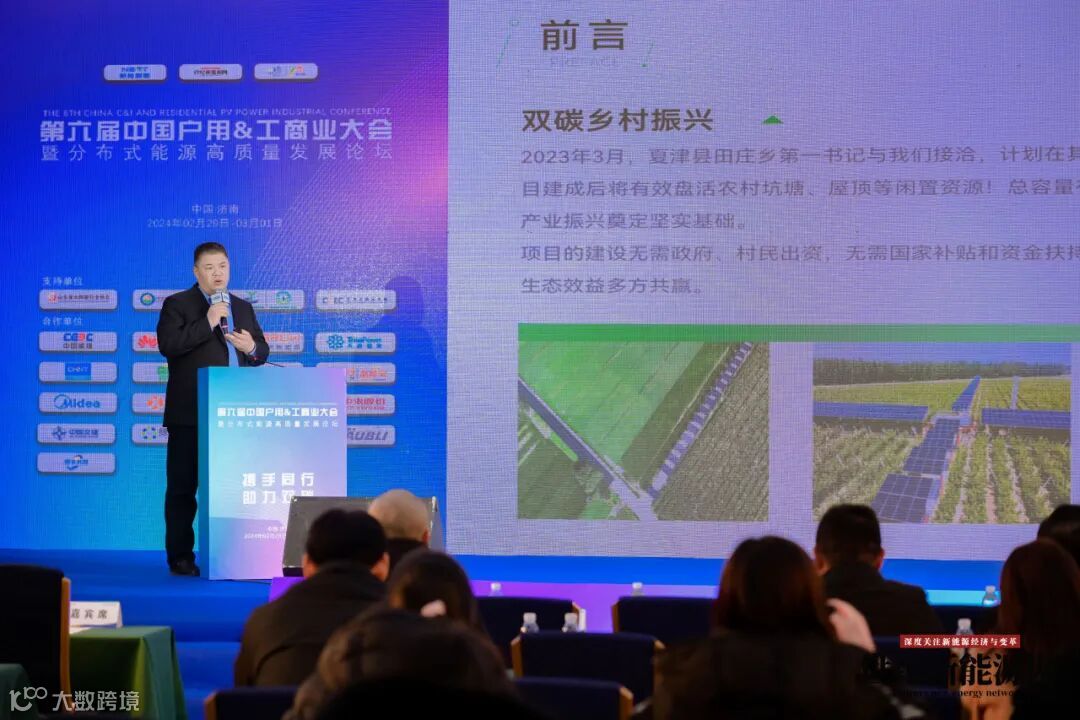 2024年2月28日,第七届中国分布式光伏大会,2024年3月1日第六届中国户用&工商业大会暨分布式能源高质量发展论坛,誉金科技董事长宋昌芳发表整村汇流EPC项目建设分享,此次分享对于在座的光伏行业人士和合作伙伴来说,是一次前所未有的全新认知。与过往熟悉的户用模式思维不同,宋董事长此次深入探讨了整村汇流模式的实践与应用。