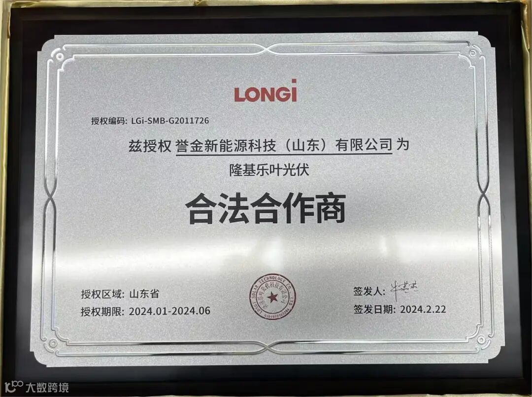 隆基乐叶光伏合法合作商授权证书