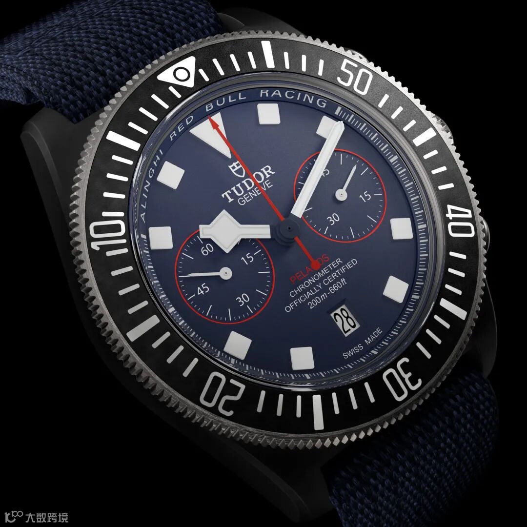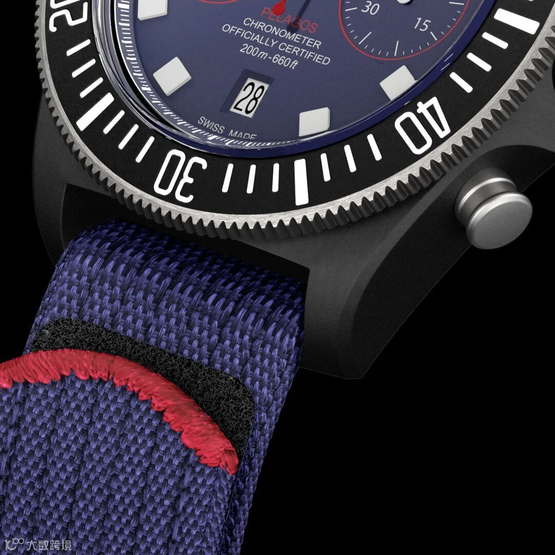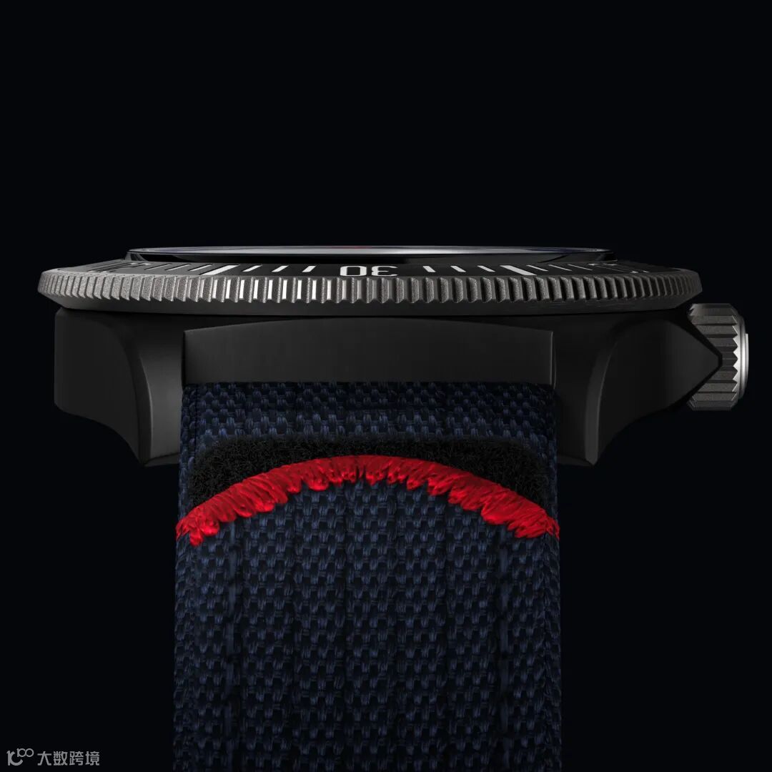 领潜型FXD配备的高科技表带同样在以船队代表性的蓝色为主调,并点缀红色装饰。