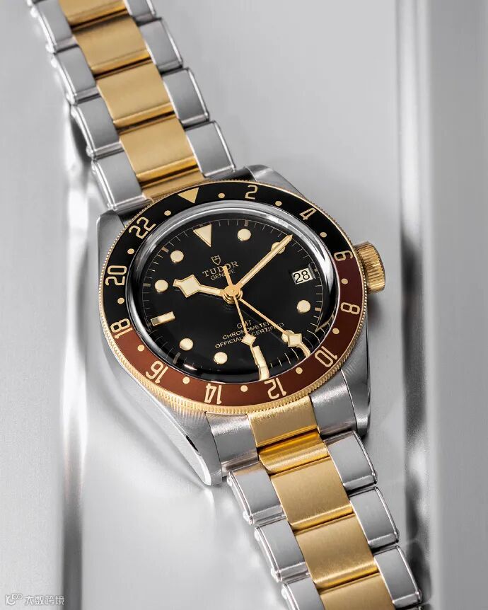 帝舵碧湾格林尼治黄金钢款,配备直径为41毫米直径不锈钢表壳,搭配24小时哑光棕及黑色旋转外圈,尽显奢华质感。