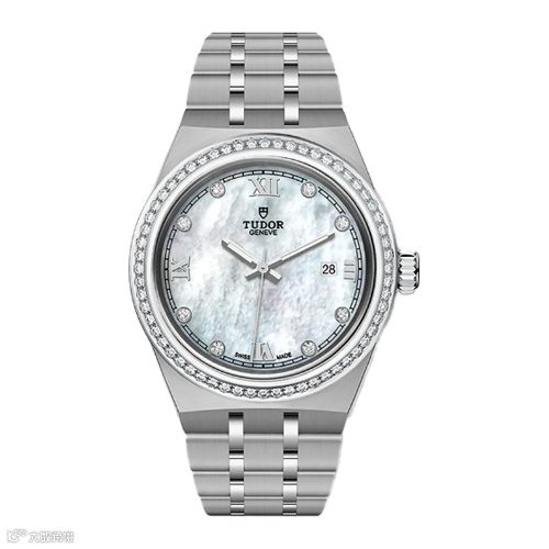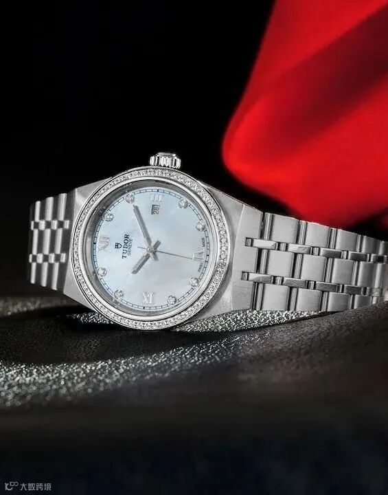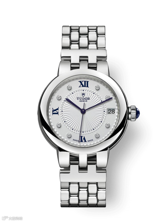 其中有八颗罗马数字钟点标记亦可替换为镶钻时标。钢制外圈镶嵌60颗钻石,搭配利落银色三针,彰显闪耀动人的女性魅力。