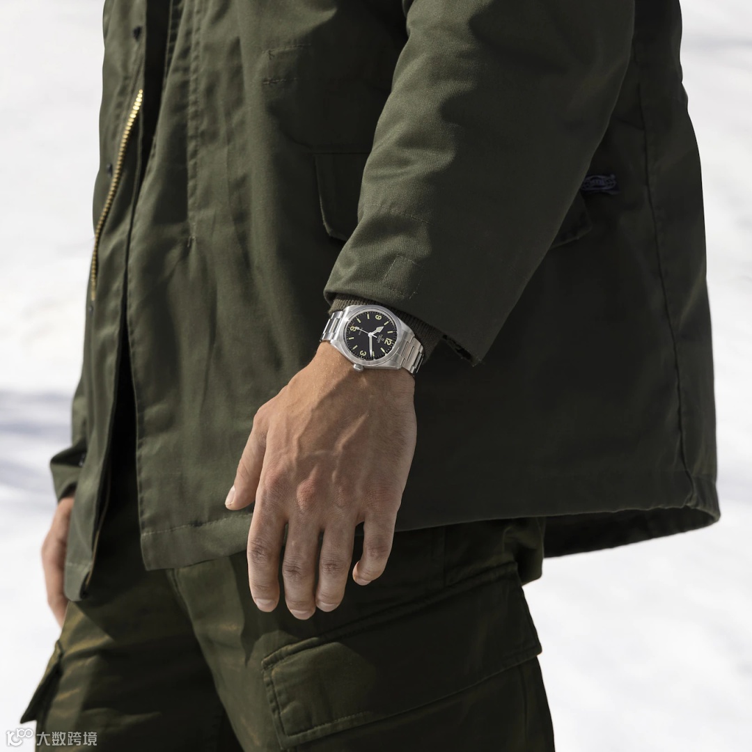 配备39毫米不锈钢表壳和醒目的圆拱形表盘,方便读取时间。阿拉伯数字与条形刻度、箭型指针上均涂覆有A级瑞士 Super-LumiNova® 夜光涂层,即使身处暗境,亦能随心掌控时间。