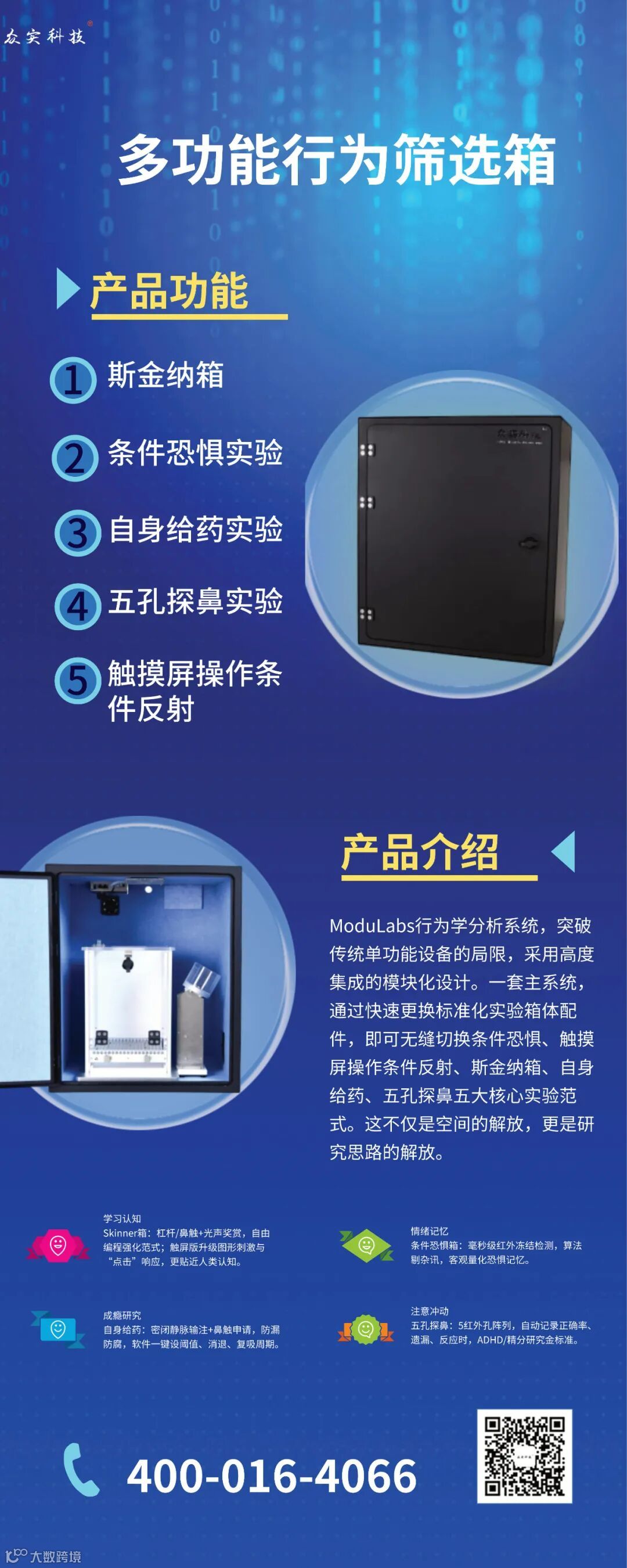 科研探索不应受设备所限。众实科技推出新一代多功能行为筛选箱,集斯金纳箱、条件恐惧、自身给药、五孔探鼻、触摸屏操作条件反射五大经典实验于一体,真正实现“一箱多用,范式灵活切换”,为您打造高效、智能、可持续升级的行为学研究平台。