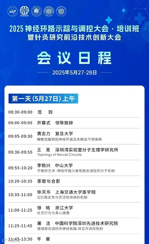 由中国神经科学学会神经科学研究技术分会、中国神经科学学会科技转化与创新工作委员会和深圳市脑科学学会联合主办的“2025神经环路示踪与调控大会·培训班暨针灸研究前沿技术创新大会”将于今年5月27-30日在深圳召开。本次大会聚焦神经科学的最新前沿技术,聚集活跃于神经环路结构解析与功能研究领域的优秀科学家,分享研究思路、科研成果和发展趋势,促进跨学科交叉融合和应用转化。
