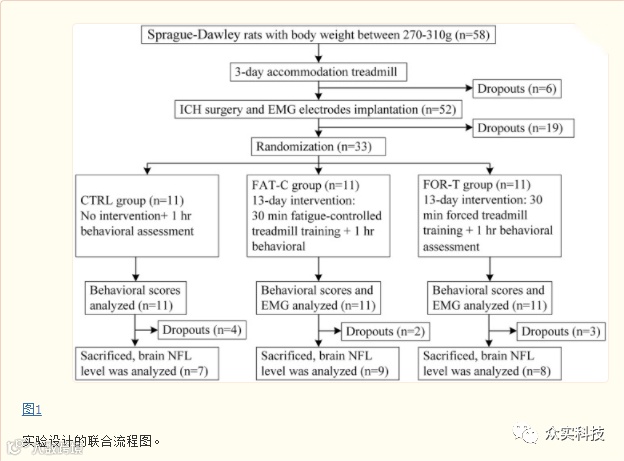 从卒中后第2天到第14天,对三组进行了不同的康复干预。CTRL组没有进行康复训练。对于FOR-T组,大鼠被迫在跑步机上以16m/min的速度跑步,每天持续30分钟,不休息 。如果老鼠停留在跑步机轨道的尽头,没有赶上跑步机,实验者会在老鼠的背部轻轻推一下,迫使它们继续跑步。