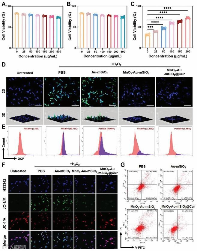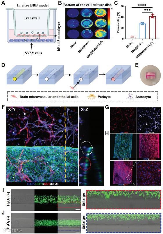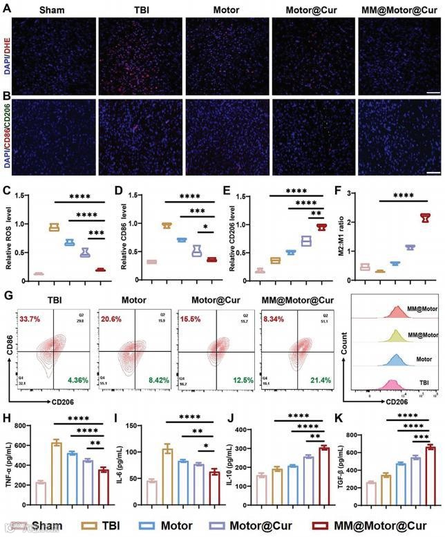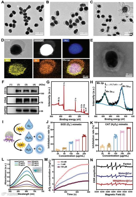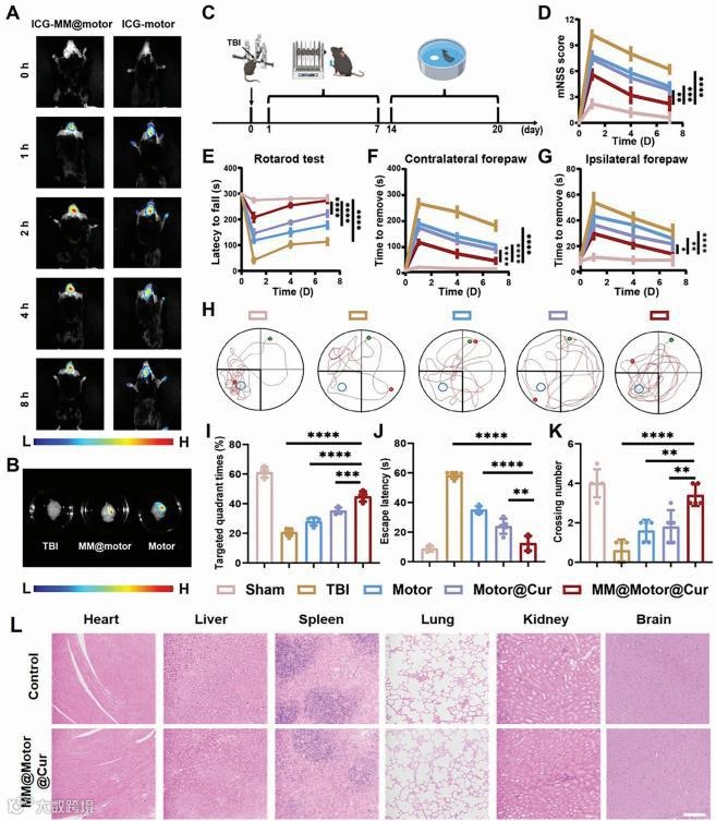 首先,通过柠檬酸还原法合成了高质量的金纳米颗粒(≈ 50nm)(图2A)。作者使用脂质体挤出机制备了巨噬细胞膜(MM)囊泡。为了实现靶向递送以缓解TBI相关的炎症,MM囊泡和纳米马达通过脂质体挤压机共挤压多次,从而形成仿生的MM包覆的纳米马达(图2E)。通过Western blot分析进一步证实了MM囊泡成功地包裹在纳米马达的外表面(图2F)。这些实验技术和结果为合成提供了全面的证据.