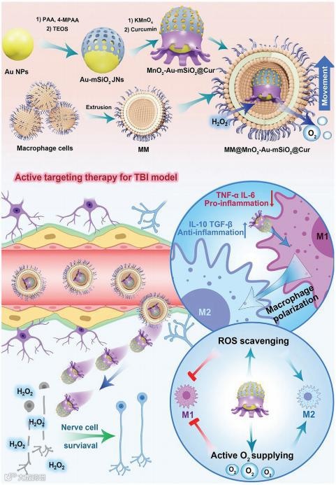 在本研究中,作者提出了一种级联深部脑传递策略,利用仿生细胞膜修饰的自推进纳米运动器MM@MnO2-Au-mSiO2用于靶向抗炎治疗。通过模拟巨噬细胞的表面特征,仿生纳米运动体可以通过血液流动积极地积累在炎症区域,而不受血脑屏障的阻碍 。