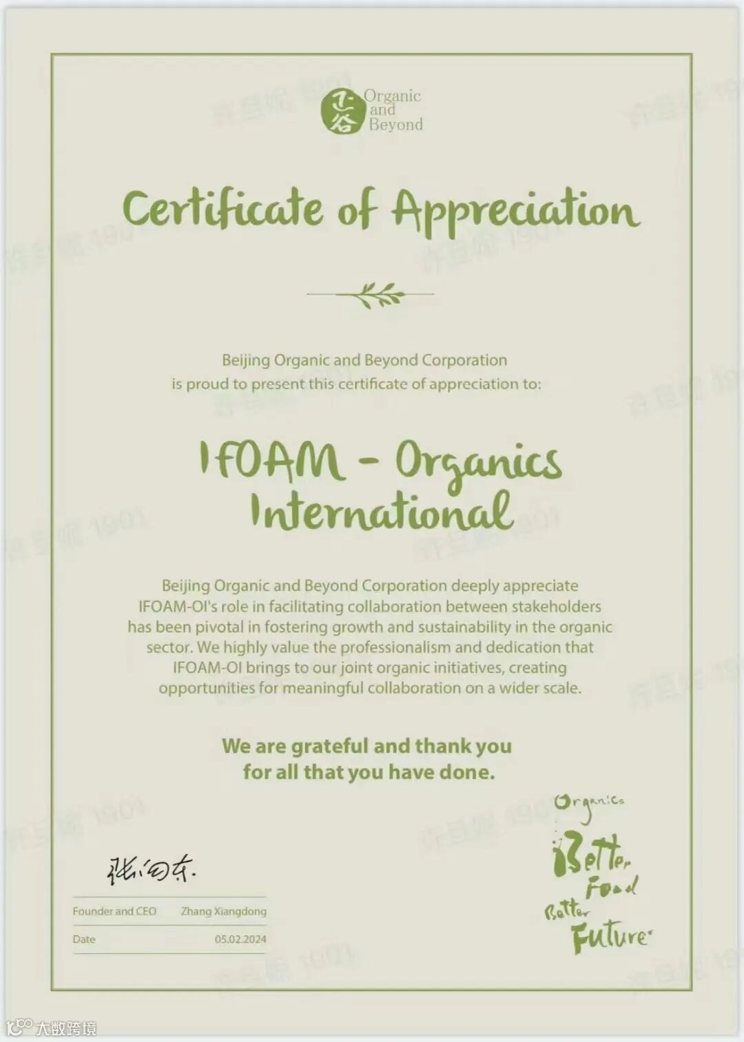 展会期间,张向东向IFOAM国际有机联盟主席Karen Mapusua赠送致谢信,并交流:“IFOAM国际有机联盟在促进利益相关者之间的合作方面发挥了决定性的作用,对于促进有机部门的增长和可持续性至关重要。我们非常重视IFOAM为我们推动中国有机行业发展带来的专业精神和奉献精神,为更广泛范围内有意义的合作创造了机会”。