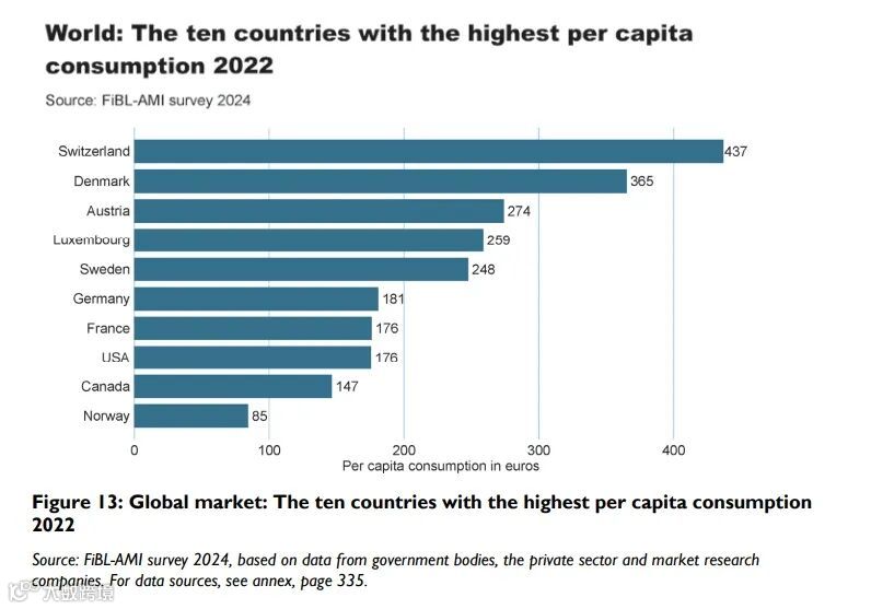 2022年,全球人均有机产品消费约为17欧元;瑞士排名第一,为437欧元,其次是丹麦365欧元,奥地利274欧元以及卢森堡259欧元。中国截至2022年的人均消费为9欧元。