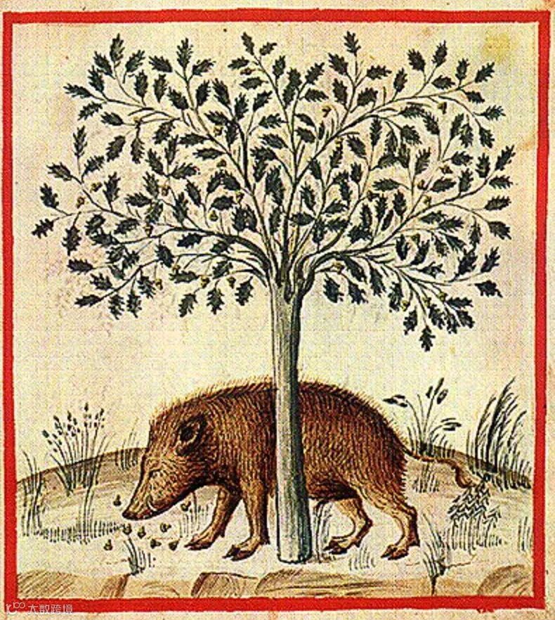 一幅中世纪的插画作品:一头猪在橡树下吃类似橡果的食物