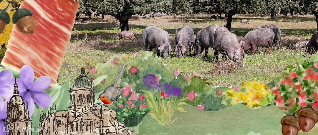 于是,当捻起一片伊比利亚火腿放入口中,感受火腿逐渐融化的过程,甜而不腻,咸而不干,橡果的香气、海盐的鲜味、还有火腿肉质咸香在口腔中逐一绽放,仿佛置身在西班牙Dehesa平坦起伏的林间草场上,感受着山风徐徐而来,伊比利亚黑猪在草地上自由徜徉。