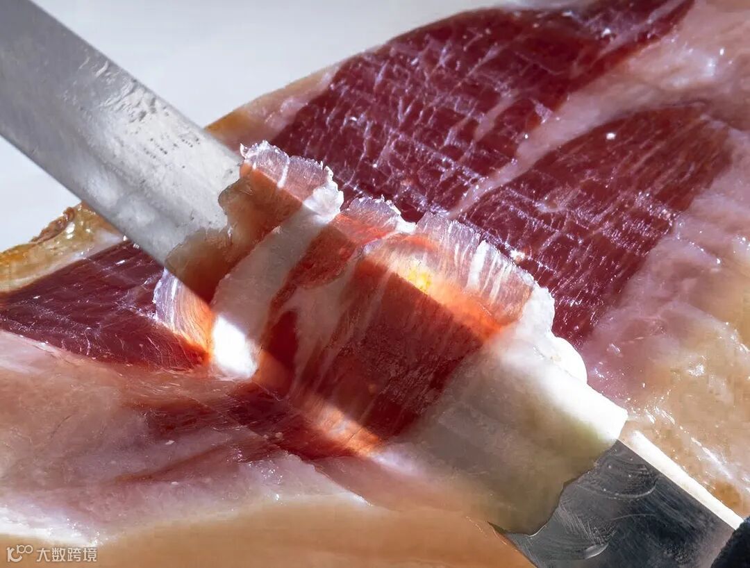 已经切片的正谷100%伊比利亚火腿,呈半透明状,于室温下软化,油脂浸润,不需要借助刀叉,直接用手捏起一片,轻轻嗅闻就能感受到扑鼻的香气和浓郁的橡果风味;随着指尖升温,火腿的质地更加油润,放入口中慢慢感受火腿逐渐融化的过程,层次丰富、微妙而平衡。搭配一杯雪莉酒或香槟,更添风味,让人沉醉。