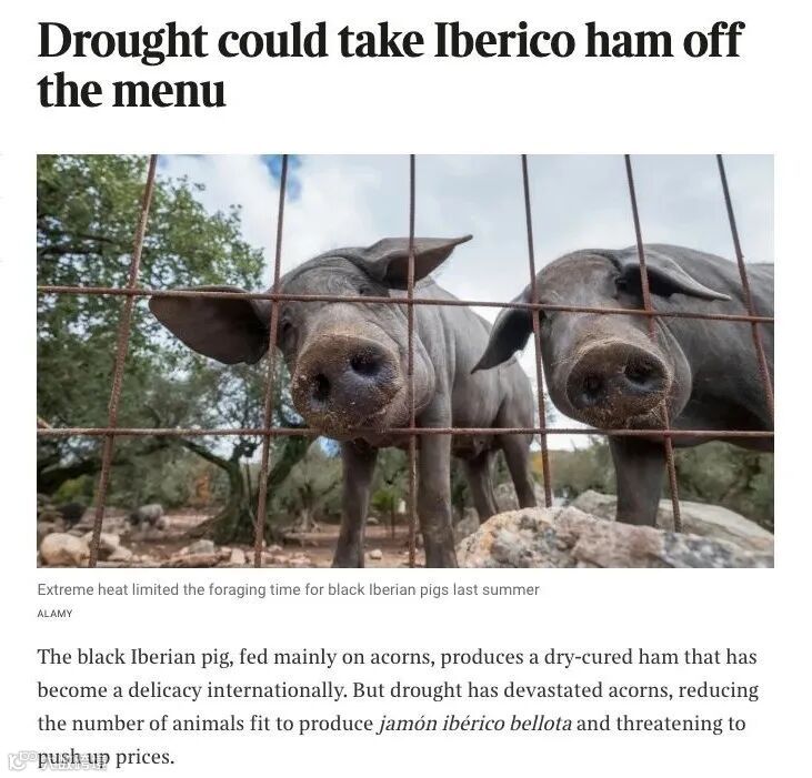 Drought could take Iberico ham off the menu,这是发表在The Times的一篇报道,其中指出“干旱导致橡树结果率大幅减少,以2023年为例,橡果产量比2022年减少了20%”[6]。