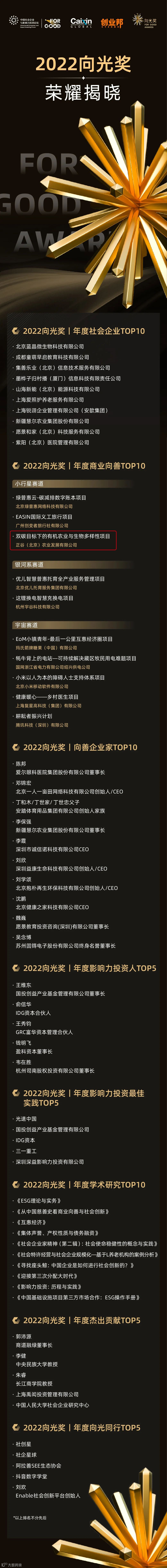 本次评选,共60个企业、投资机构、企业家、投资人、研究机构和研究者获得2022向光奖的年度荣誉,和所有五百多位申报者、八十多位专家、以及所有往届奖项的参与者一起,共同构建了社会价值的创新生态。向光奖主办方也期待通过向光奖的平台,链接更多认同并践行商业向善的企业家、践行资本向善的投资机构、研究者和行业伙伴,推动中国商业和投资重塑使命,向善发展。合力共生,一起向光而行!