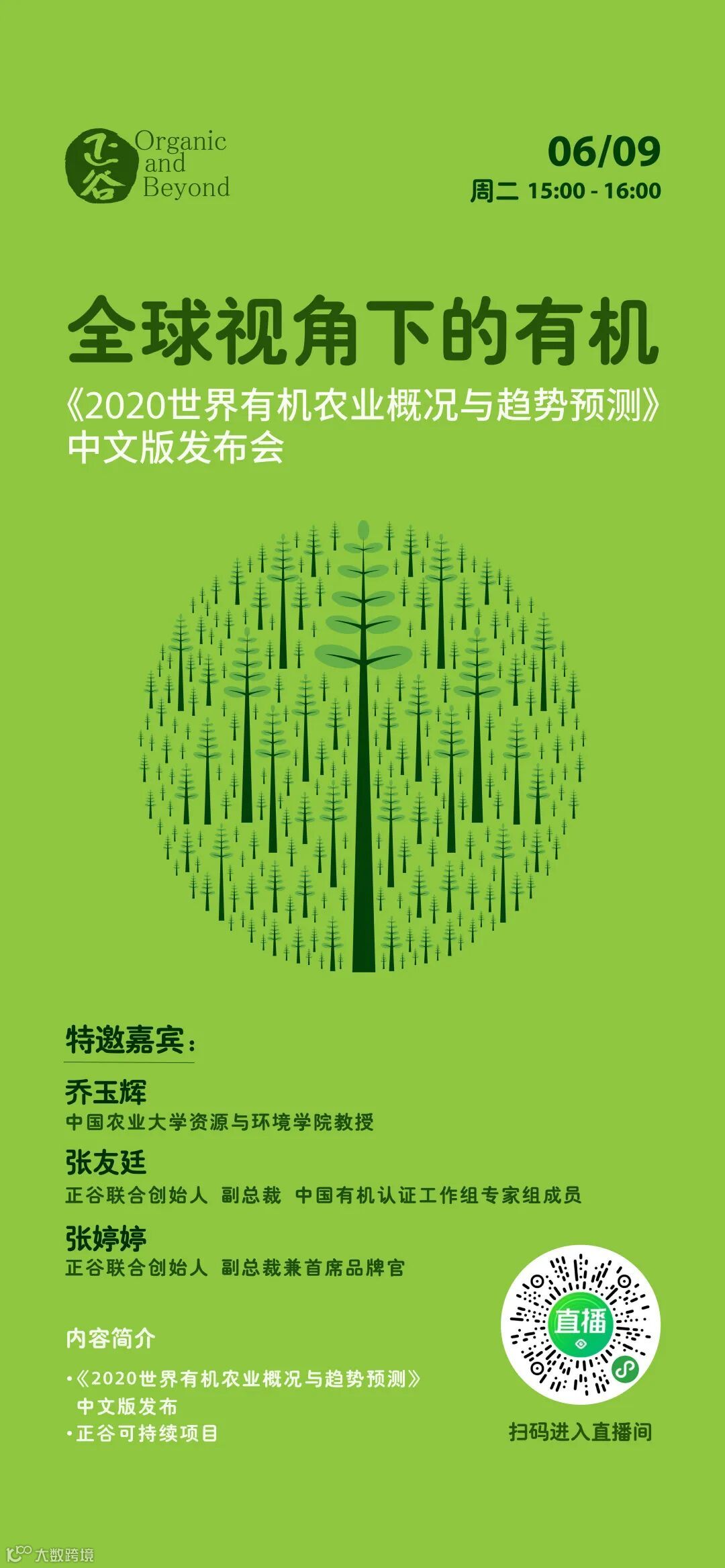6月9日下午,正谷联合创始人、副总裁张友廷,首席品牌官张婷婷将对话中国农业大学资源与环境学院教授乔玉辉,并对《2020年世界有机农业概况与趋势预测》中文版进行发布。