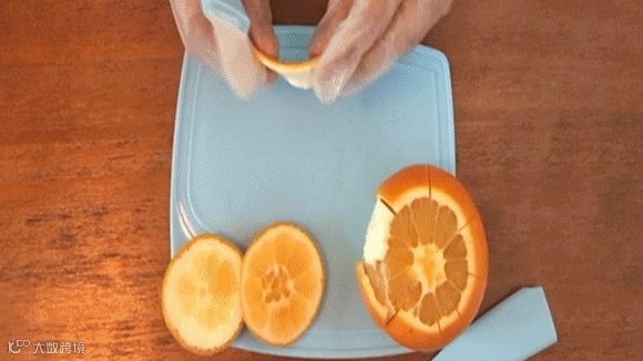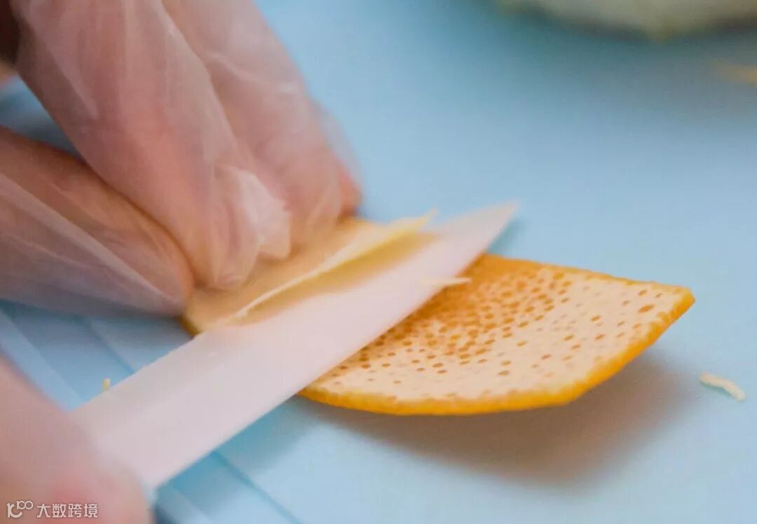 剥开脐橙果皮,可以看到果瓣周围包着白色软皮,