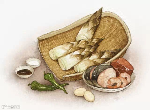 那次家宴我努力按浙江菜谱去认真做的一道菜叫“兰花春笋”,这是一道示春菜,工序两道:先取春笋嫩头,刀剖成兰花状,浸在凉水中待其展开,肉馅(本应是鱼茸)成粒,摆在花心里,洒上火腿末,蒸熟。再炒熟碧绿的鸡毛菜为围,春笋摆成圆围在其中,笋花上浇上勾薄芡的鸡汤。选择这个菜是因色调与意境,可惜不会做鱼圆,以肉替代,不仅少了鲜白色,口感截然不同,也少了江南春意。