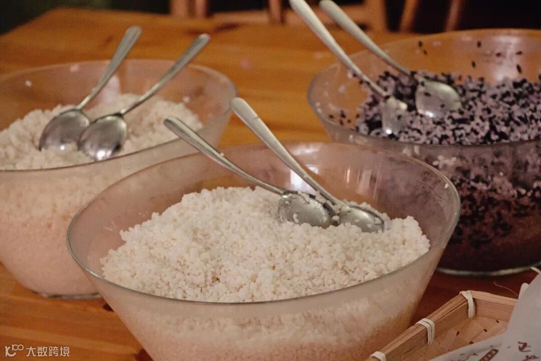 我们准备了五彩绳、箬竹叶,泡好有机糯米、黑米,