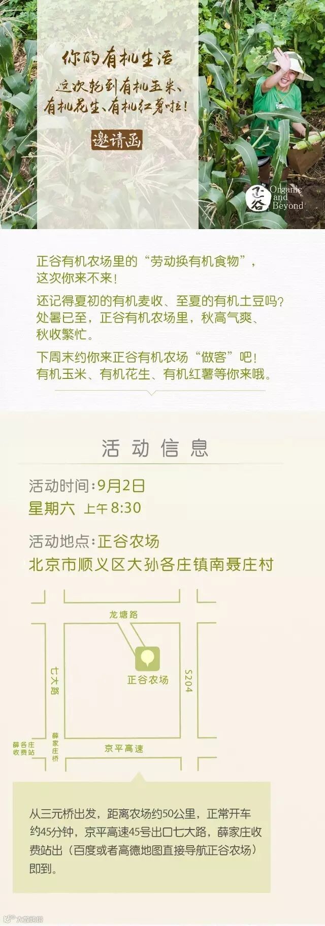 本次活动免费参与,还能获得有机玉米、有机花生、有机红薯哦~名额有限,先到先得!(以“留言回复入选通知”为入场凭证。)