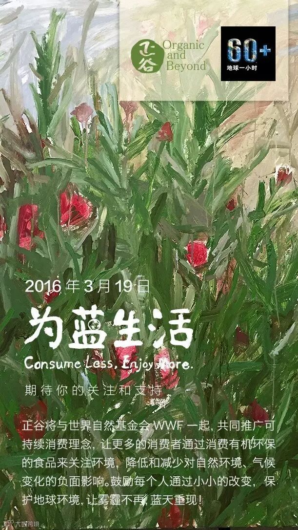 正谷&“地球一小时”关键字:有机、适度、可持续。2016年3月19日(星期六)晚8:30至9:30,“地球一小时”倒计时!
