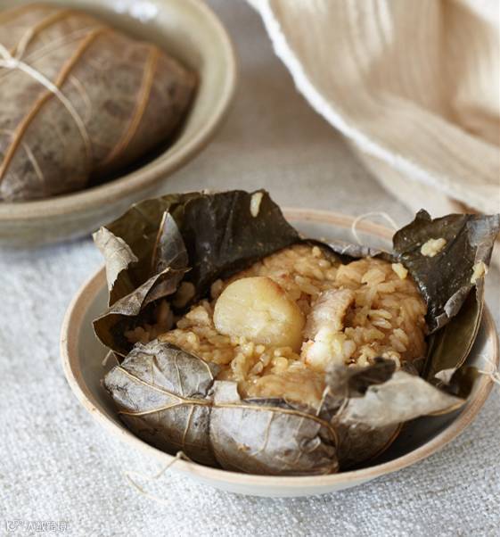 【主要食材】600g煮熟并冷却的有机原稻米饭,7g盐,150g阿拉斯加贝柱,真鳕,鲑鱼,虾或狭鳕,3g姜末,15g葱末,12g老抽,35g橄榄油,1g芝麻油,15g花雕酒,按需准备干荷叶(提前浸湿)和麻绳