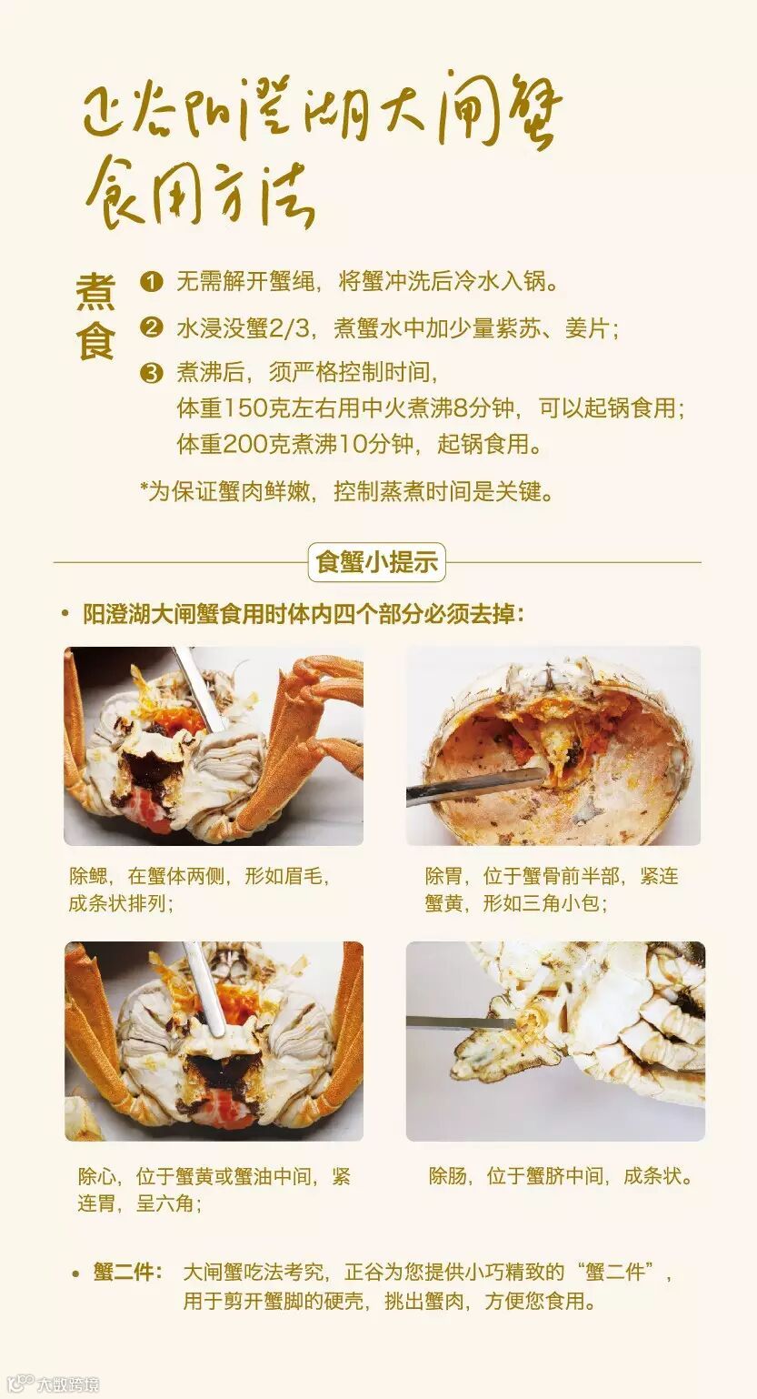 阳澄湖大闸蟹本身甘甜肥嫩,最适宜用蒸煮的方式,细细品味。蟹性寒凉,食用时配上一杯花雕酒或姜茶,蘸些蟹醋,既可以去寒,味道也愈加鲜美。煮蟹吃蟹虽然简单,也是有小技巧在里面,下面一起来看一看吧!