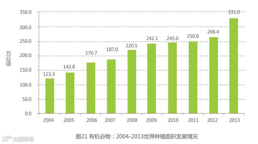 世界有机谷物的种植面积从2004年(123.3万公顷)到现在增加了2倍多。仅在2013年,面积就增加64.6万公顷(24%)即24个百分点,主要是因为从中国获取到了更详实的耕地使用数据(图 21)。