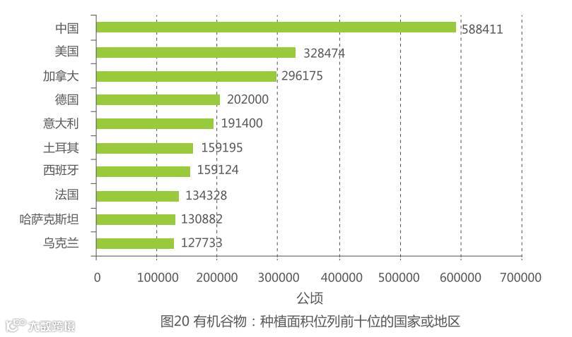 根据联合国粮农组织提供的数据,全球主要谷物生产国是印度(9710万公顷)、中国(9300万公顷)、美国(6020万公顷)和俄罗斯(3690万公顷)。在这四个国家中 , 除了印度,其他国家的有机谷物的种植面积数据均可以获得。