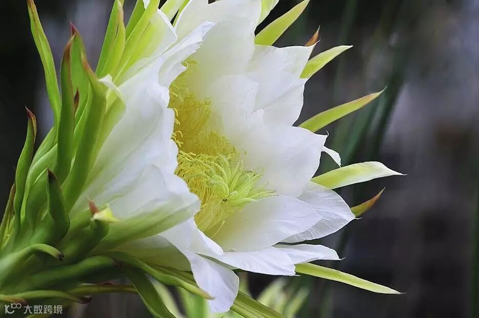形态特征:花白色,巨花长约30厘米,有霸王花之称。花萼管状,宽约3厘米,具长3-8厘米的鳞片。雄蕊多而细长,多达700-960条,花药乳黄色,花丝白色。