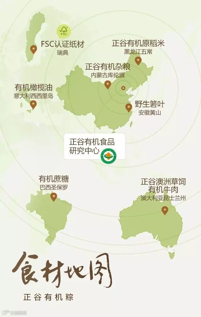 澳大利亚的有机牛肉、意大利的有机橄榄油、巴西的有机蔗糖、中国内蒙古的有机杂粮、中国黑龙江的五常有机原稻米……组成了有机粽的美食地图。优选上述正谷海外标准农场的优质食材,以安徽黄山粽叶产区的野生箬竹叶裹起,成就一枚环球食材有机粽。