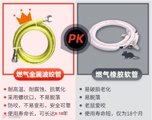 ▼燃气金属波纹管的使用年限是8-10年,相较于燃气胶管,它更耐高温、耐鼠咬、耐腐蚀、使用寿命更长,也更安全!