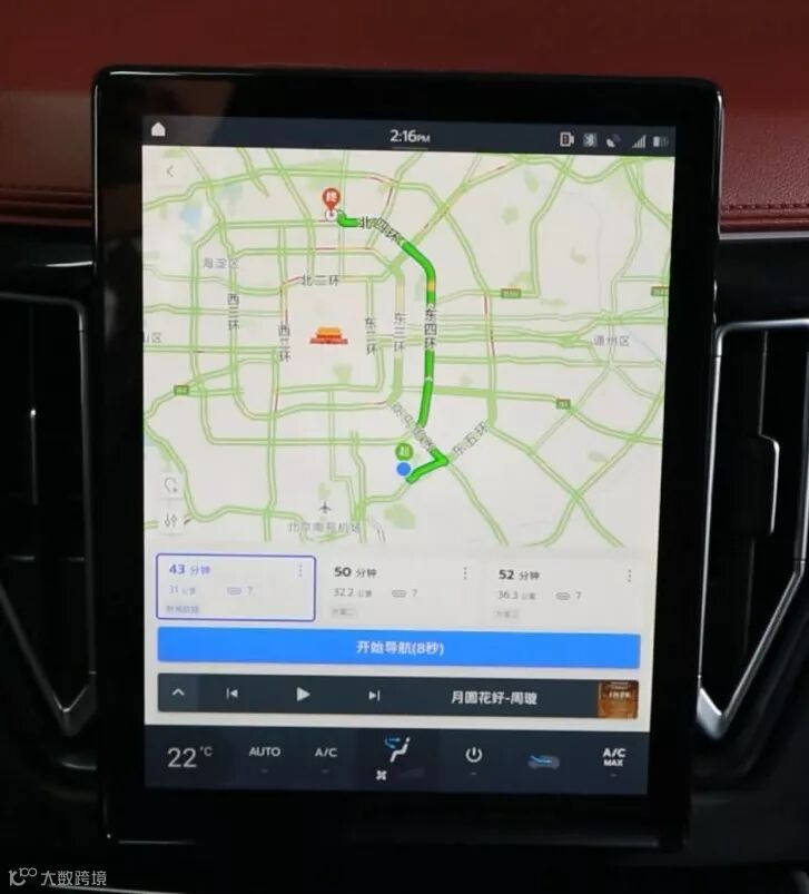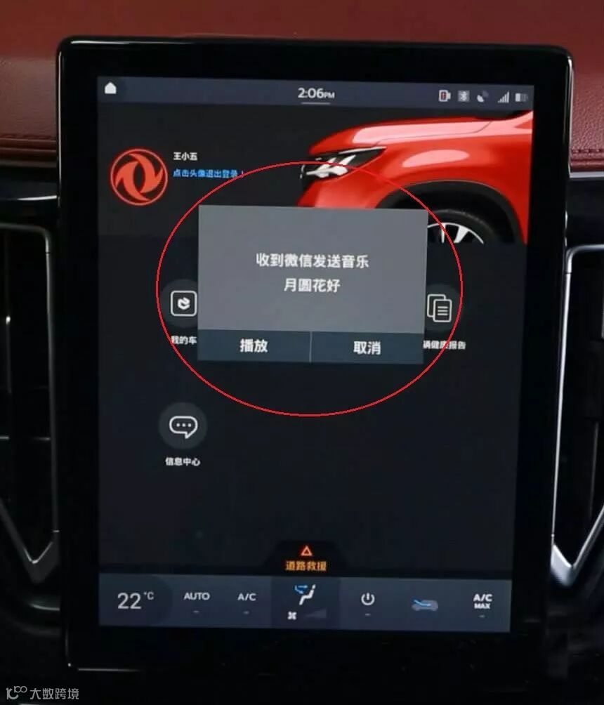 显示发送成功后,将能在车载中控大屏上收到提示。除此以外,还能将歌曲名称和演奏者名字推送到OBD上。