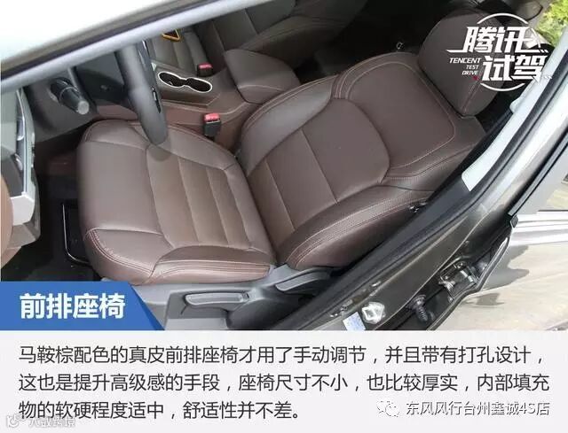 马鞍棕配色的真皮前排座椅才用了手动调节,并且带有打孔设计,这也是提升高级感的手段,座椅尺寸不小,也比较厚实,内部填充物的软硬程度适中,舒适性并不差。