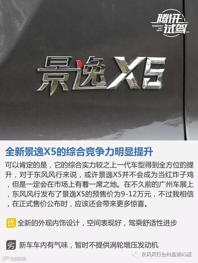 一天的试驾体验并不足以看到全新景逸X5的全部,不过可以肯定的是,它的综合实力较之上一代车型得到全方位的提升,对于东风风行来说,或许景逸X5并不会成为当红炸子鸡,但是一定会在市场上有着一席之地,在不久前的广州车展(微博)上,东风风行发布了景逸X5的预售价为9-12万元,不过我相信,在正式售价公布时,应该还会带来更多惊喜。