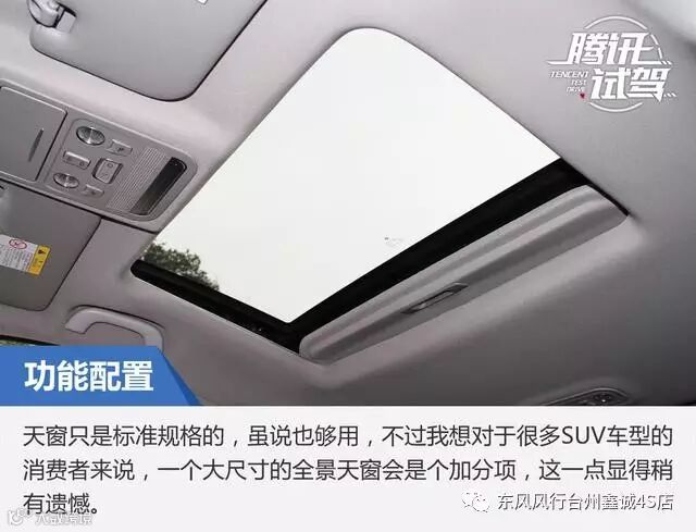天窗只是标准规格的,虽说也够用,不过我想对于很多SUV车型的消费者来说,一个大尺寸的全景天窗会是个加分项,这一点显得稍有遗憾。