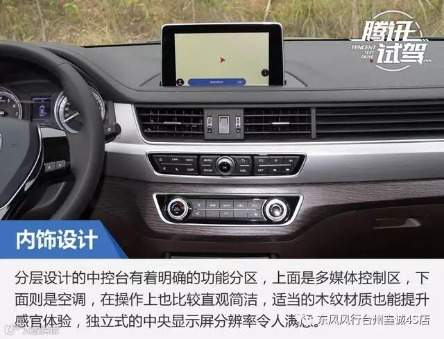 分层设计的中控台有着明确的功能分区,上面是多媒体控制区,下面则是空调,在操作上也比较直观简洁,适当的木纹材质也能提升感官体验,独立式的中央显示屏分辨率令人满意。