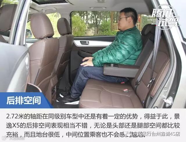 全新景逸X5 2.72米的轴距在同级别车型中还是有着一定的优势,得益于此,景逸X5的后排空间表现相当不错,无论是头部还是腿部空间都比较充裕,而且地台很低,中间位置乘客也不会感到尴尬。
