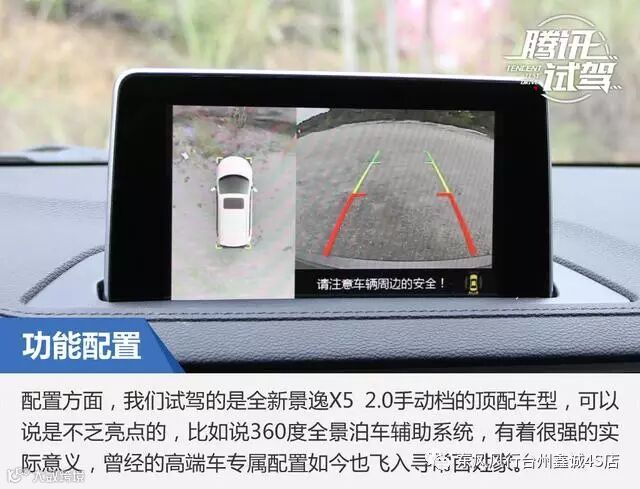 配置方面,我们试驾的是全新景逸X5 2.0手动档的顶配车型,可以说是不乏亮点的,比如说360度全景泊车辅助系统,有着很强的实际意义,曾经的高端车专属配置如今也飞入寻常百姓家。