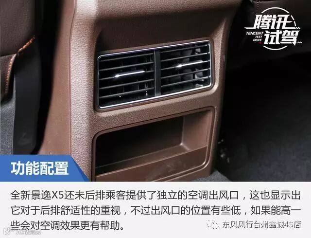 全新景逸X5还未后排乘客提供了独立的空调出风口,这也显示出它对于后排舒适性的重视,不过出风口的位置有些低,如果能高一些会对空调效果更有帮助。