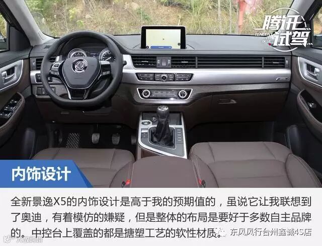进入到车内,可以说全新景逸X5的内饰设计是高于我的预期值的,虽说它让我联想到了奥迪,有着模仿的嫌疑,但是整体的布局是要好于多数自主品牌的。中控台上覆盖的都是搪塑工艺的软性材质,但是新车车内还是有着比较明显的味道。