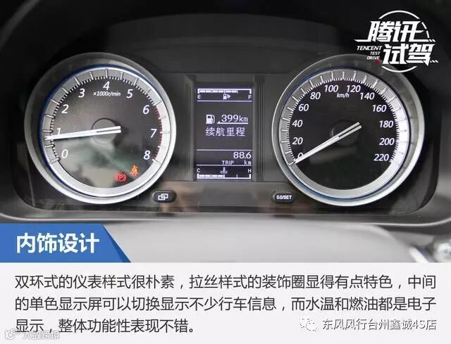 双环式的仪表样式很朴素,拉丝样式的装饰圈显得有点特色,中间的单色显示屏可以切换显示不少行车信息,而水温和燃油都是电子显示,整体功能性表现不错。