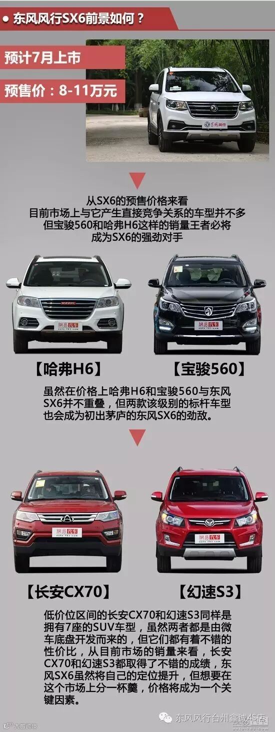 预售价8-11万元的SX6看似找准了一个目前7座SUV车型相对空白的市场,的确,在8-10万元的区间内,拥有7座的自主SUV车型并不多,与SX6直接竞争的车型目前也没有,但像哈弗H6和宝骏560这样的传统5座SUV车型已经在廉价SUV市场中积攒了良好的口碑和认知度,它们无疑会成为SX6强劲的对手。长安CX70和幻速S3虽然从底盘配置来说,不是那么纯粹的SUV车型,但其实对于这个价位的消费者来说,这一点都不重要,两者都属于配置丰富价格低廉的,性价比足够出色,从销量上也能看出它们的受欢迎程度,于此相比风行SX6有着更高的定位,但至于消费者是否买账,其实还是要看性价比,这就要等到SX6的具体售价曝光后再做分析了。