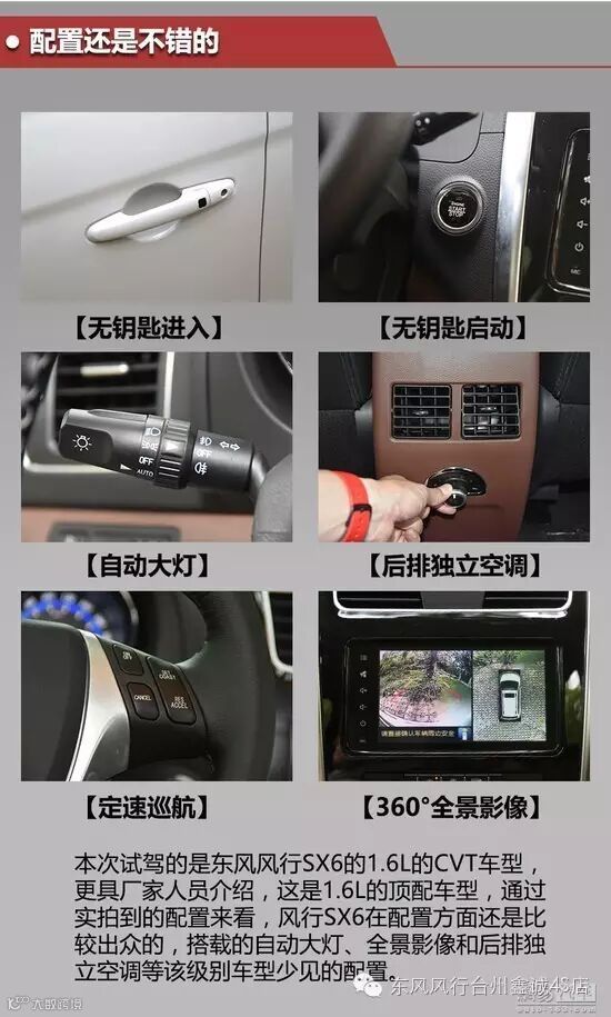 1.6L搭配CVT变速箱的组合其实更倾向于经济性和平顺性,作为一款主打家用城市使用的SUV来说,风行SX6整体的加速表现比较平顺,这个特点算是比较符合它的定位。