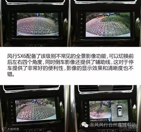 在风行S500高配车型上出现过的全景影像系统也配备在了风行SX6上,这是一个比较实用的功能,在该级别车型中也并不多见,算是本次风行SX6的一个亮点配置,全景影像可以调整前后左右四个角度的单独显示,摄像头的照射范围也比较广,清晰度也不错,实用性很强。