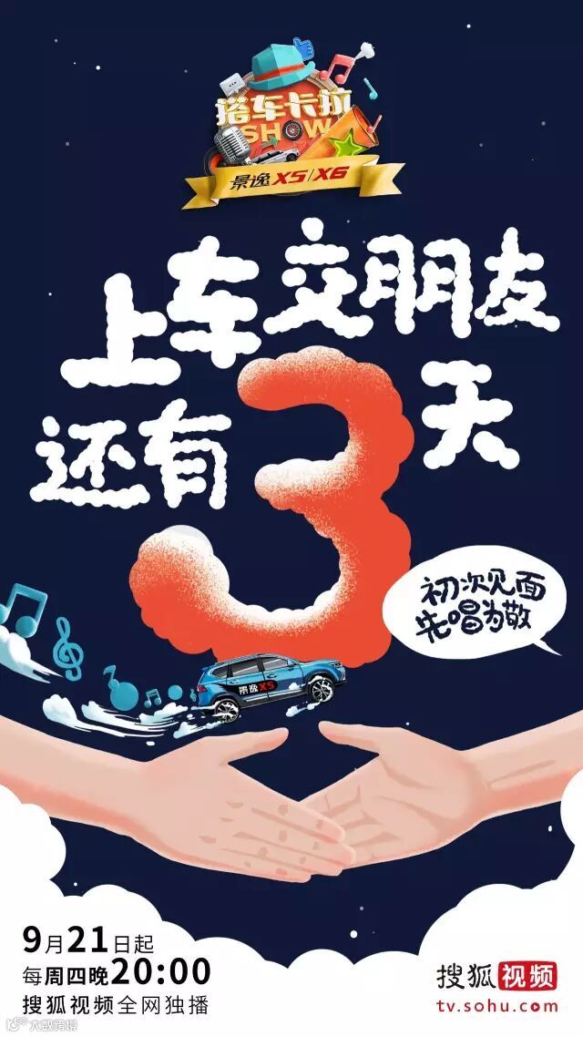 由景逸双T首席冠名的国内首档户外情景演绎拼车真人秀——《搭车卡拉SHOW》即将炫酷“飙唱”啦!景逸双T奔跑赞助show全程,化身移动的卡拉OK厅,载上主持人“大鹏”,还有众多大咖明星,在座驾里约定你,开一场特别的“演唱会”!