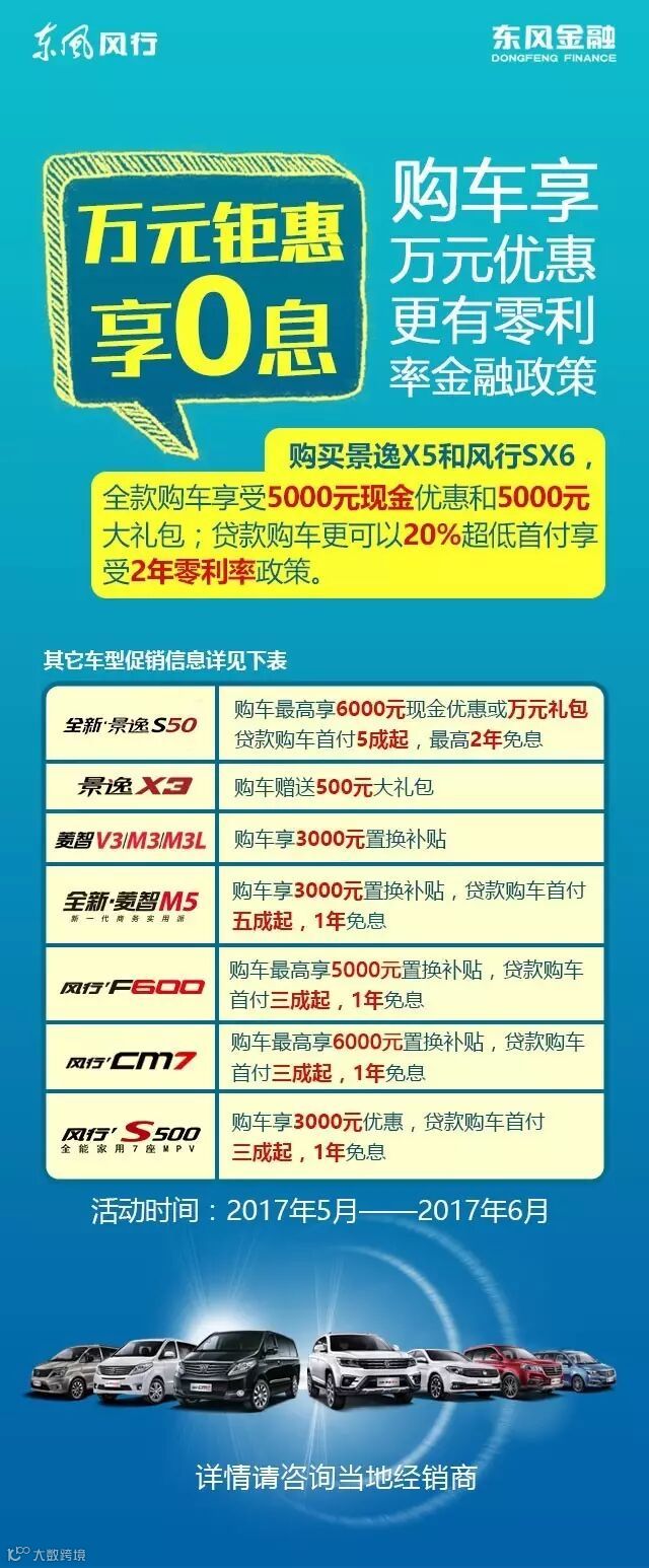 为感谢消费者对东风风行转型升级的认可与信赖,东风风行推出“万元钜惠享0息”活动:
